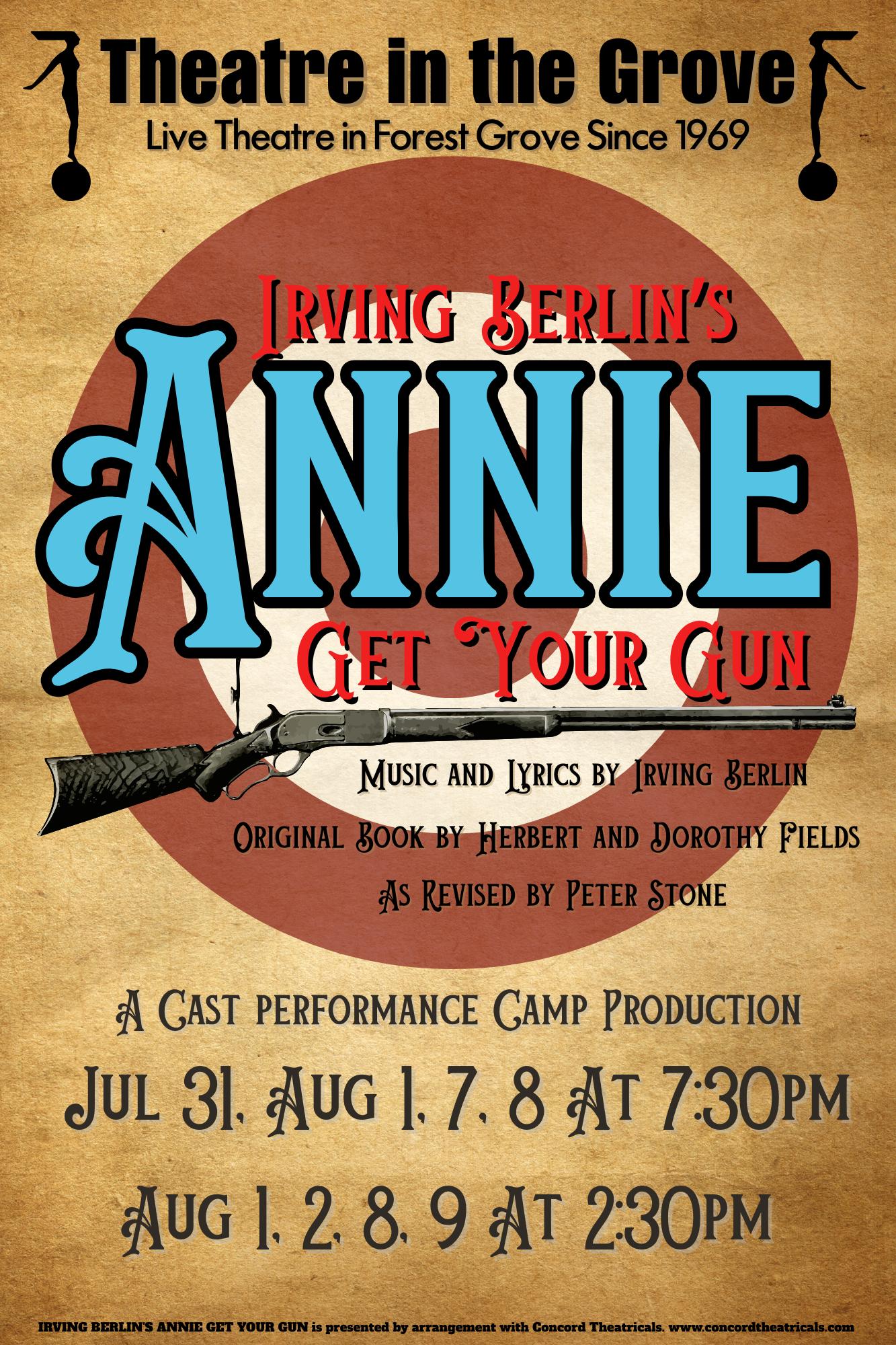 This production is proudly presented as part of Theatre in the Grove’s CAST Summer Youth Camp—an educational program designed to inspire and nurture young performers. Through CAST, students receive hands-on experience in acting, singing, and stagecraft, culminating in a full-scale musical production. Annie Get Your Gun offers campers a wonderful opportunity to explore classic American musical theatre, while learning about teamwork, storytelling, and performance.
